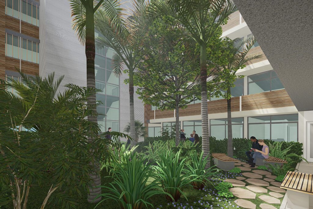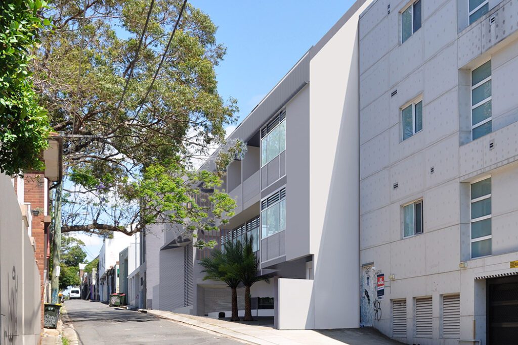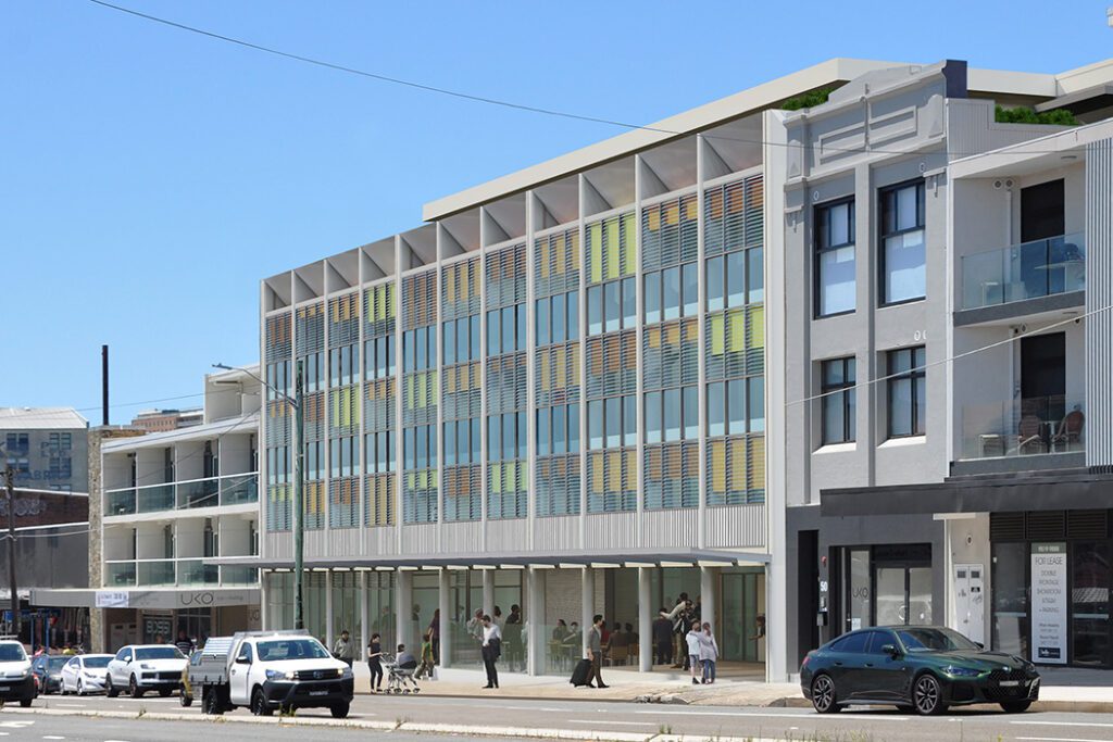 Stanmore Co-living is a proposed development comprising 101 rooms arranged around a central courtyard. The building includes ground-floor retail and a café addressing the street, along with a generous entry foyer. Communal living rooms on each level culminate in a north-facing rooftop terrace, providing additional outdoor amenity for residents. To the south, the building form is raked to minimise solar impact on neighbouring properties. Coloured external blinds enliven the north façade, giving the street elevation a distinct identity.
